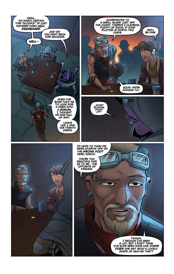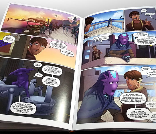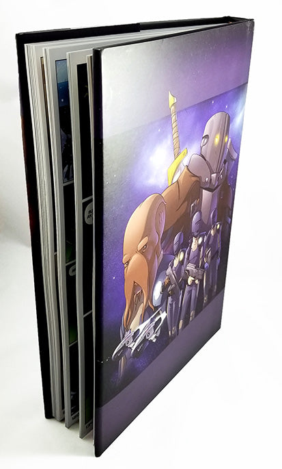 The Starcaster Chronicles Volume One collects issues #1-5 of the sci-fi space adventure featuring Cort, Speck and Nyrah, and their quest to locate an ancient artifact of incredible power. The story has been shaped through the years by the will of the audience through online voting that affects the outcome of certain decisions. Full color, 176 pages, on 150gsm high quality matte paper. Full color hardback with a dustjacket featuring the same cover art for additional protection. Also includes a download for a digital PDF of the book!